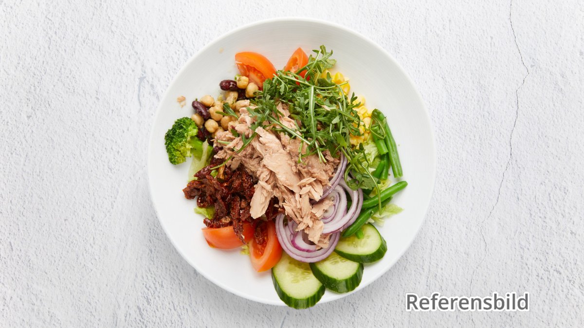 Färsk tonfisk med babyspenat, mâche, avokadokräm, mango, rädisor. - Vegetariskt alternativ finns (chèvre i stället för tonfisk).