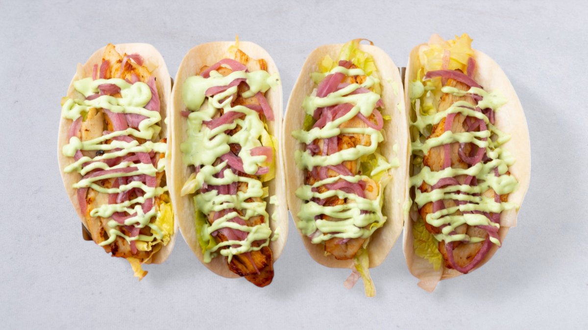 4 st vetetortillas fyllda med taco kryddad stekt kycklingfilé, isbergssallad, avokadodressing och picklad rödlök.