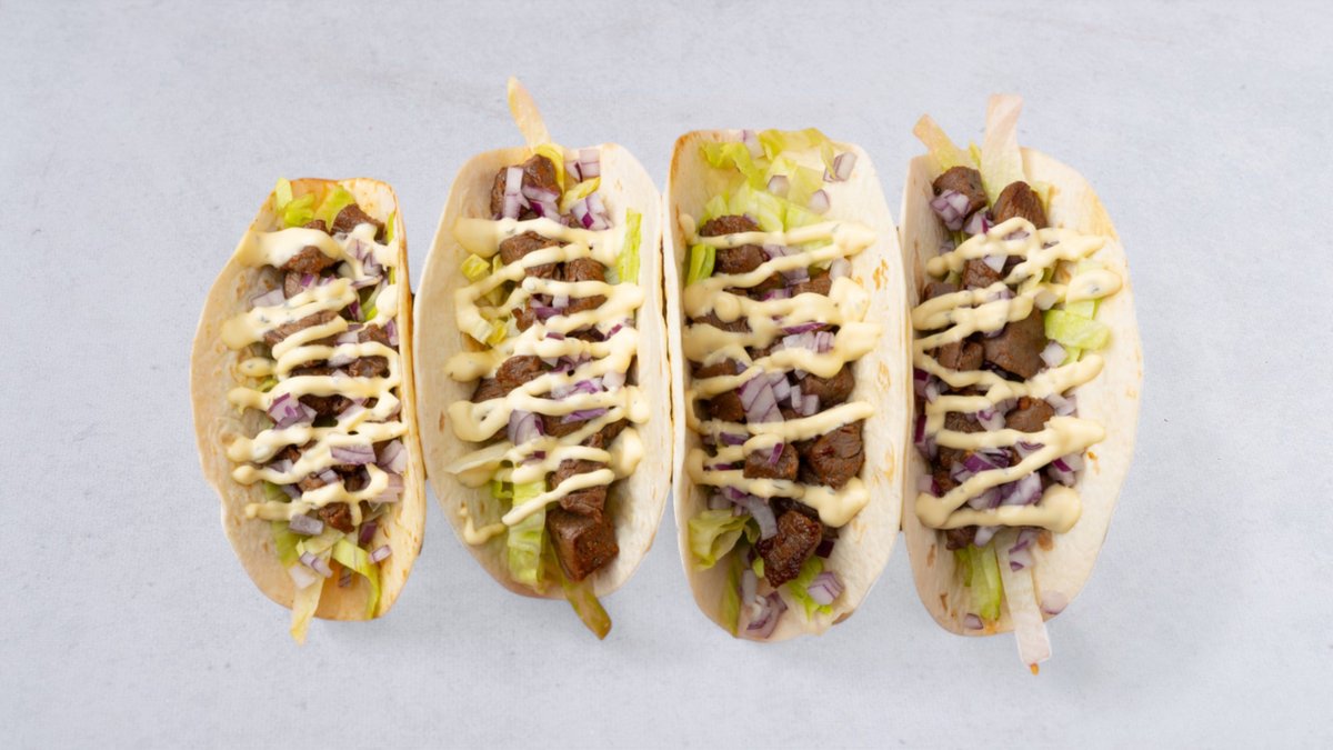 4 st vete tortillas fyllda med kryddad oxfilé, bearnaisesås, isbergssallad och hackad rödlök.