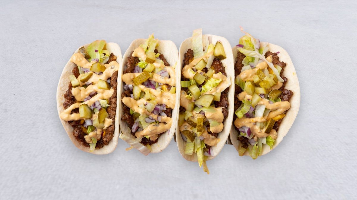 4 st vetetortillas smashad med högrevsburgare, smält cheddarost, hamburgerdressing, isbergssallad, saltgurka och hackad färsk rödlök.
