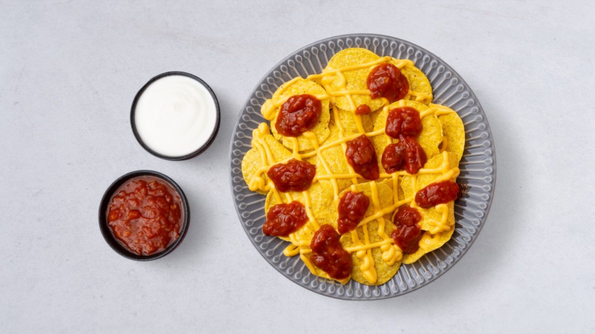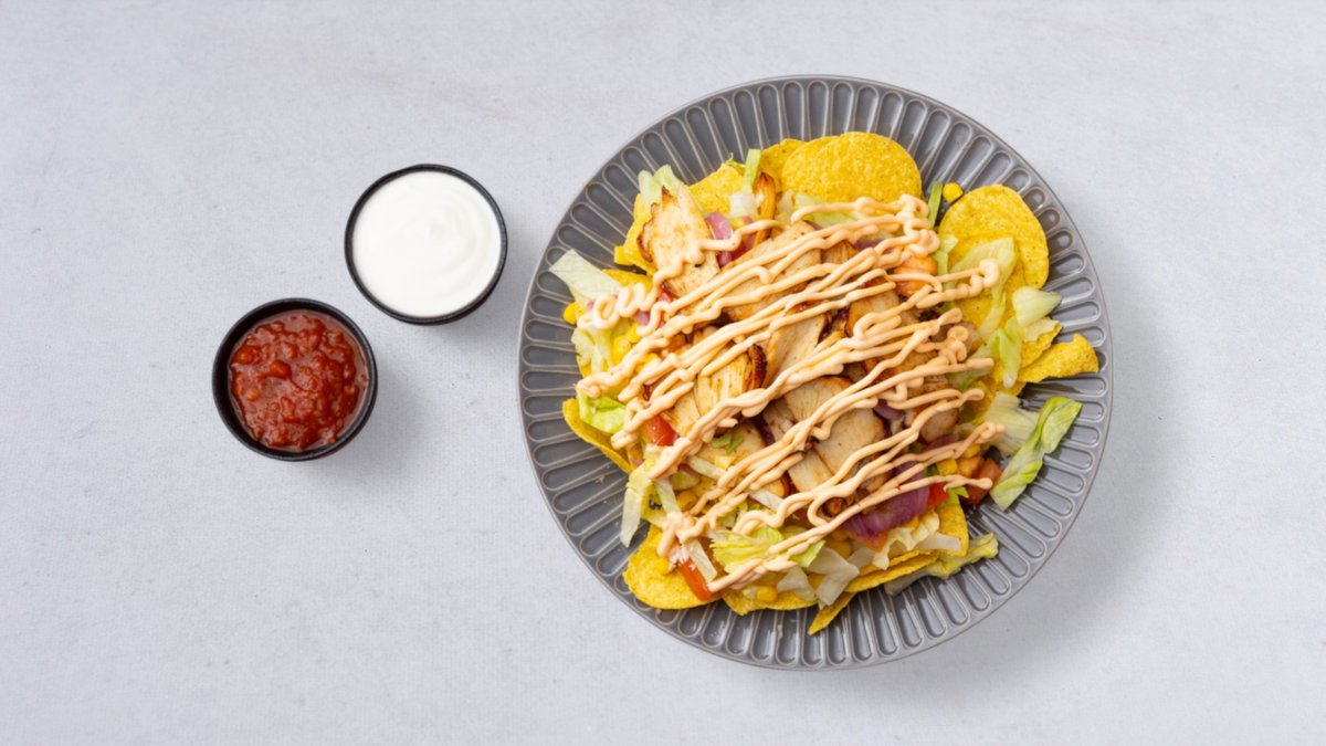Nachochips toppad med ost, taco kryddad stekt kycklingfilé, isbergssallad, majs, tomat, picklad rödlök, jalapeño och Srirachamajonnäs. Serveras med salsa och gräddfil.