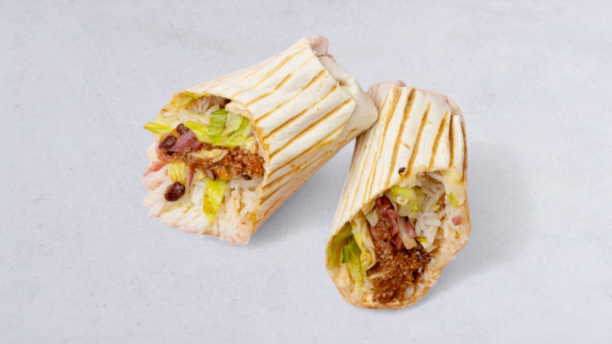 Vetetortilla fylld med taco kryddad nötfärs, ost, svarta bönor och isbergssallad. Välj mellan ris, coleslaw eller pommes.