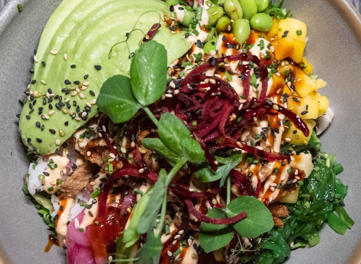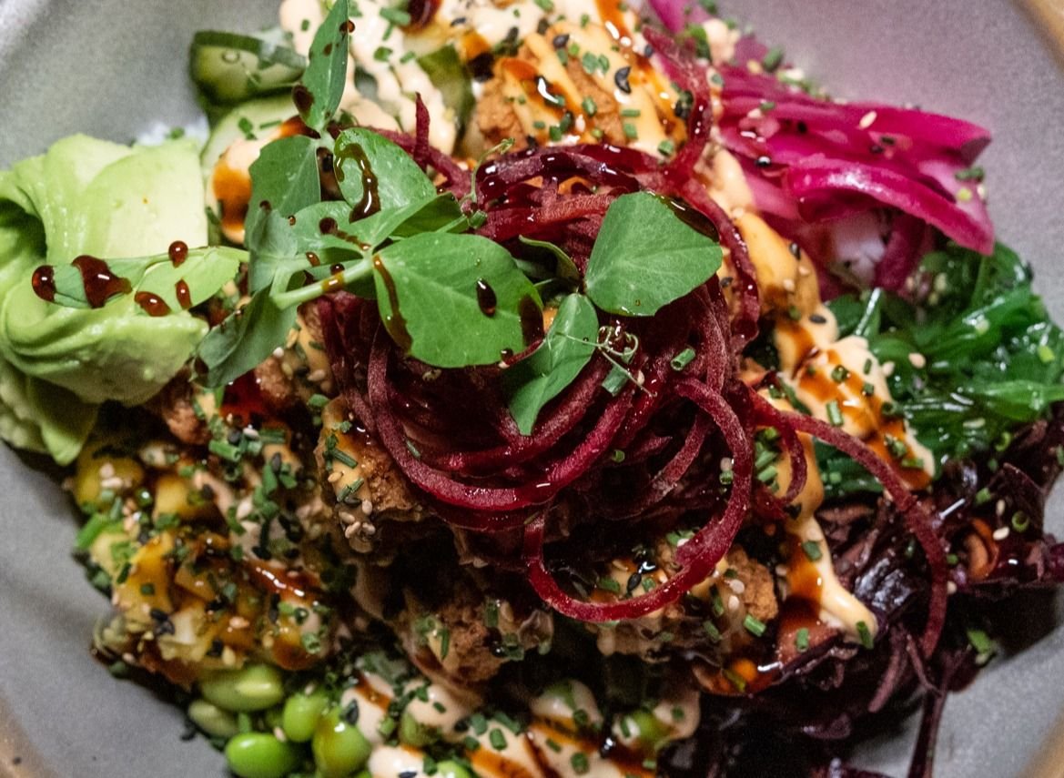 Friterad Halloumi,ris,sallad,avokado,picklad rödlök,picklad gurka,wakame,edamamebönor,mango och icha signature sås