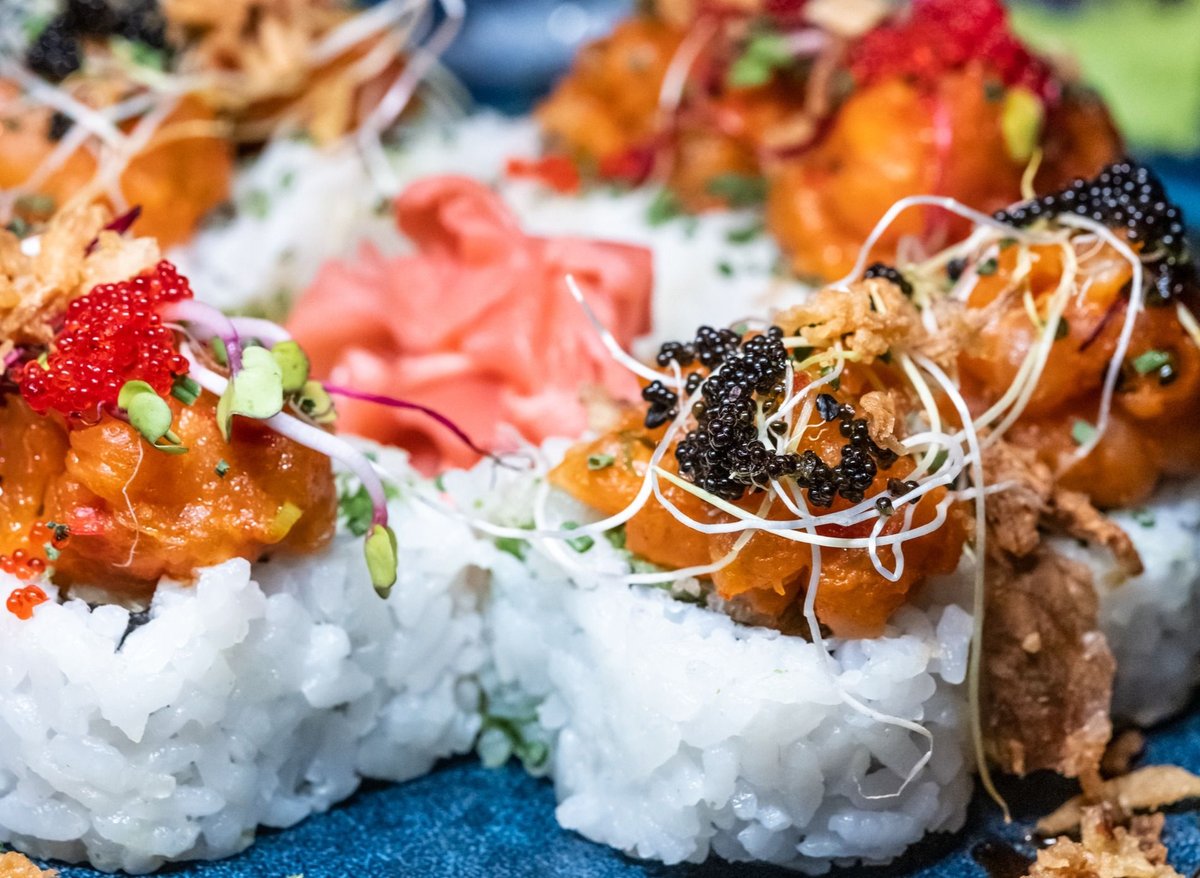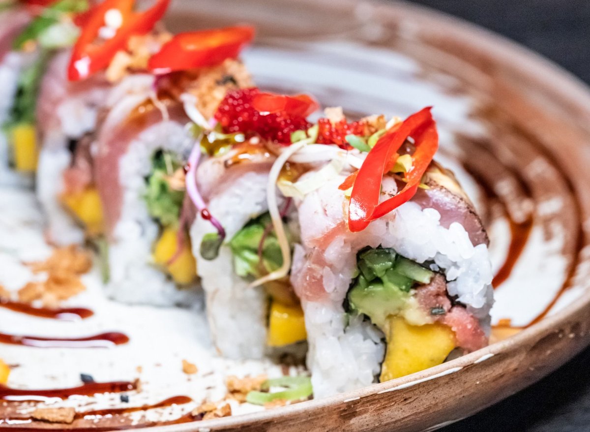 Spicy tuna, avokado, gurka mango, toppad med flamberad tonfisk och mango chilimayo