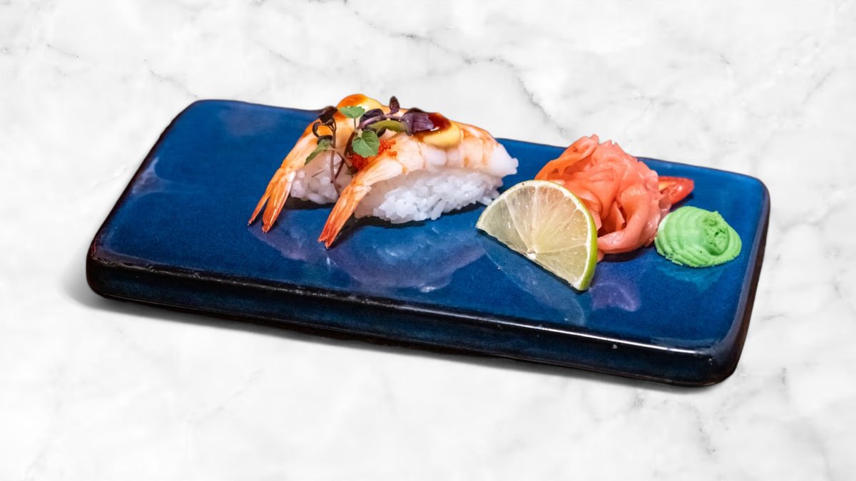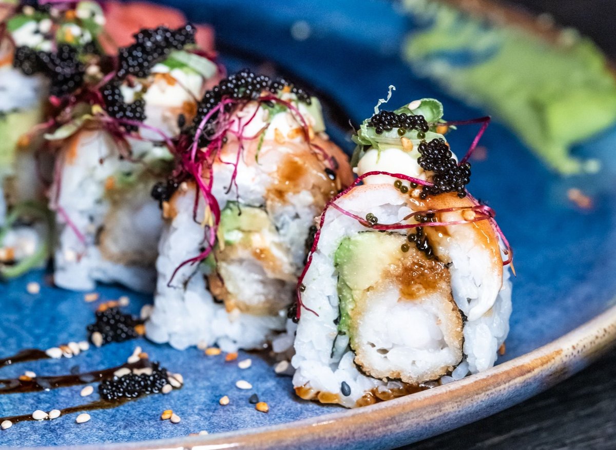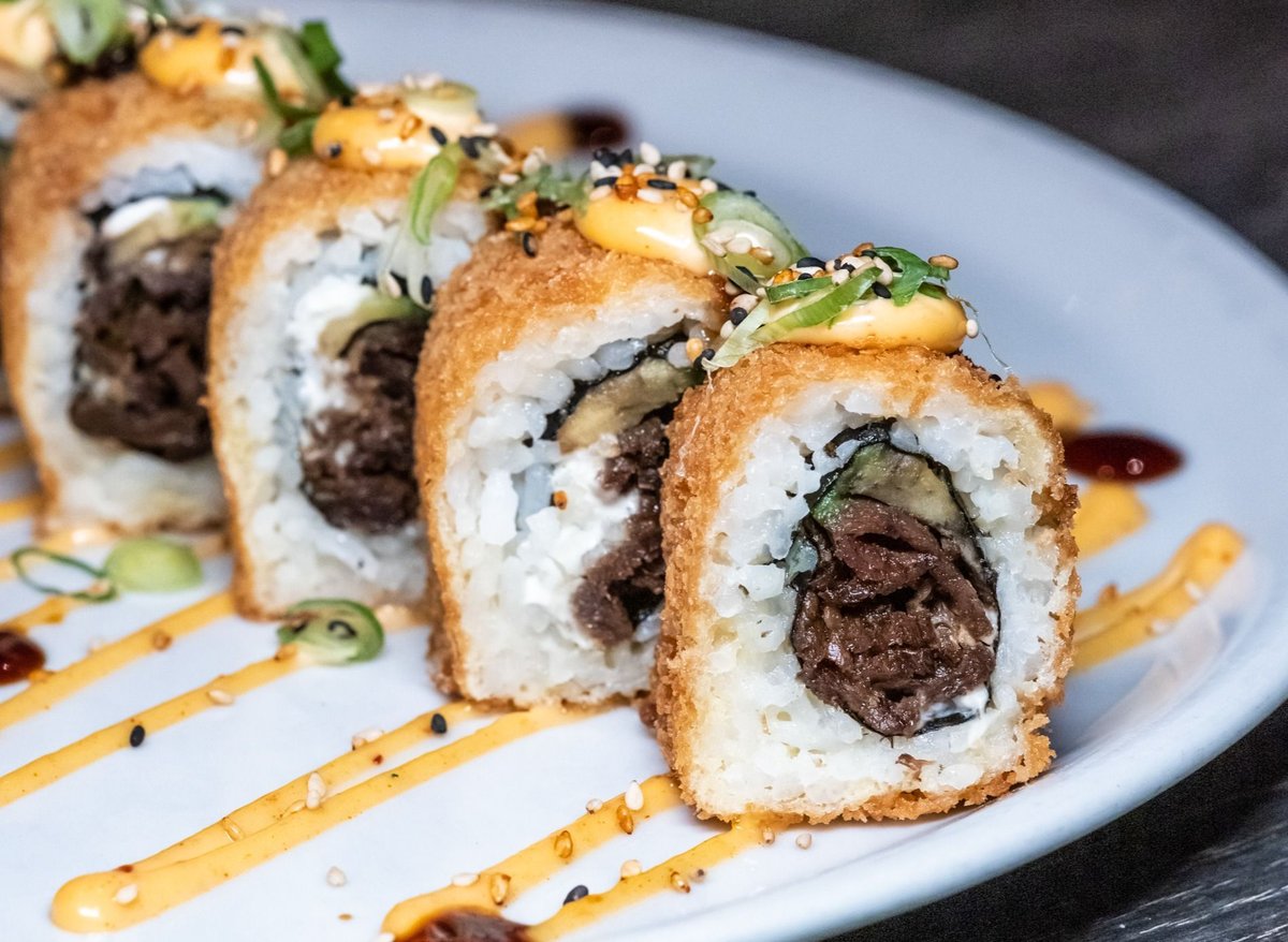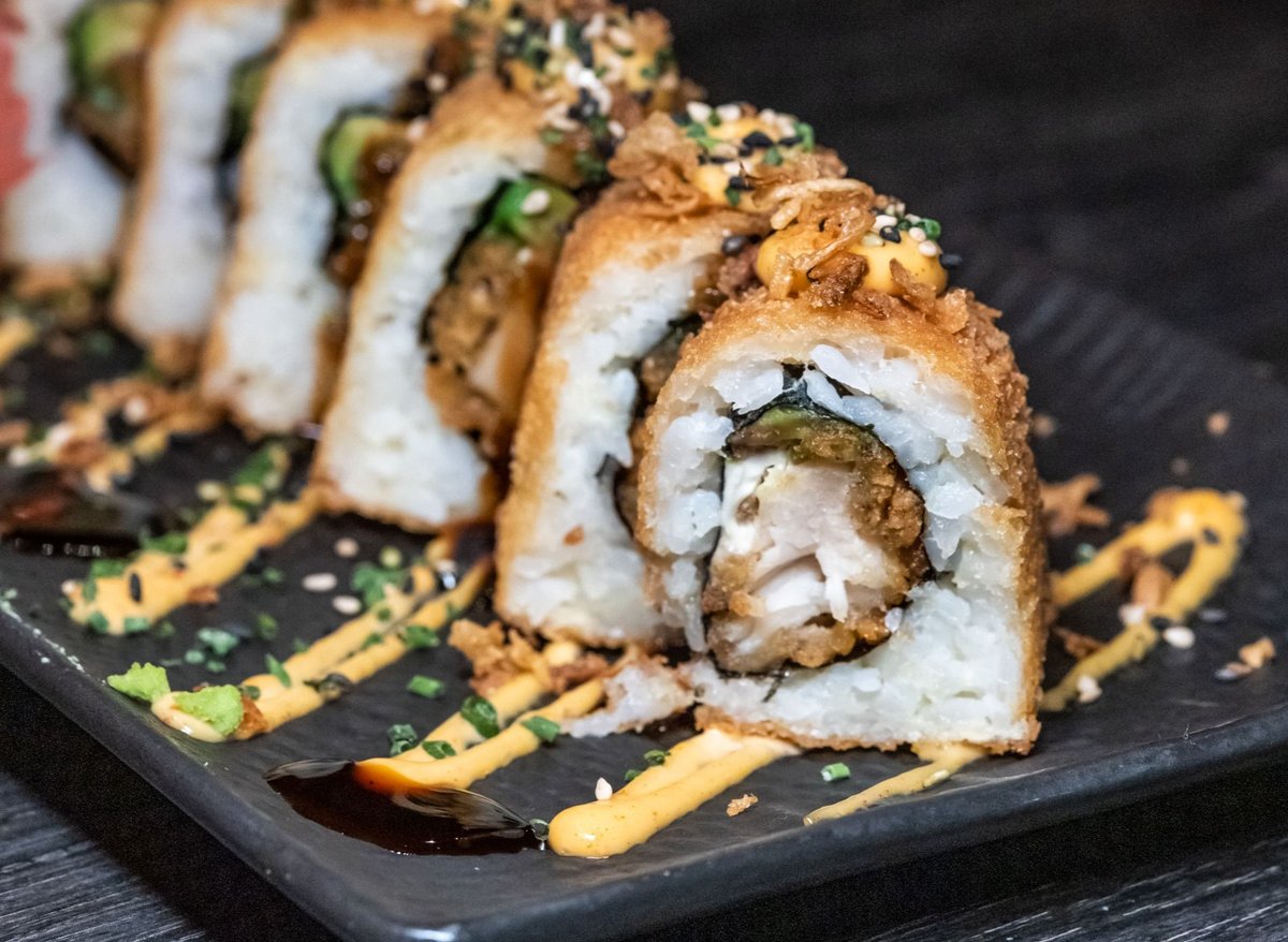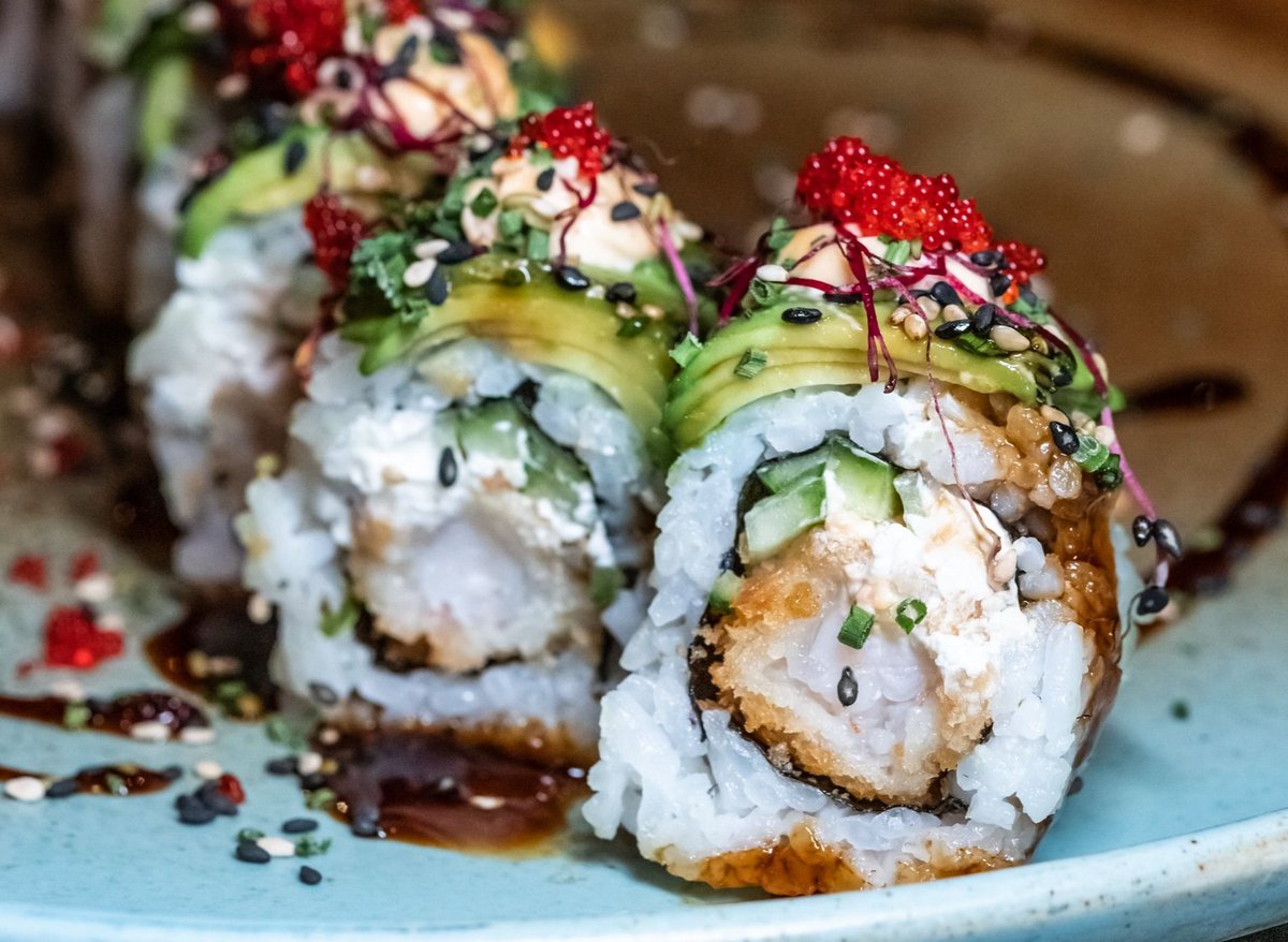 Pankofriterade räkor och philadelphiaost. Toppad med avokado, chilimajonnäs och teriyakisås.