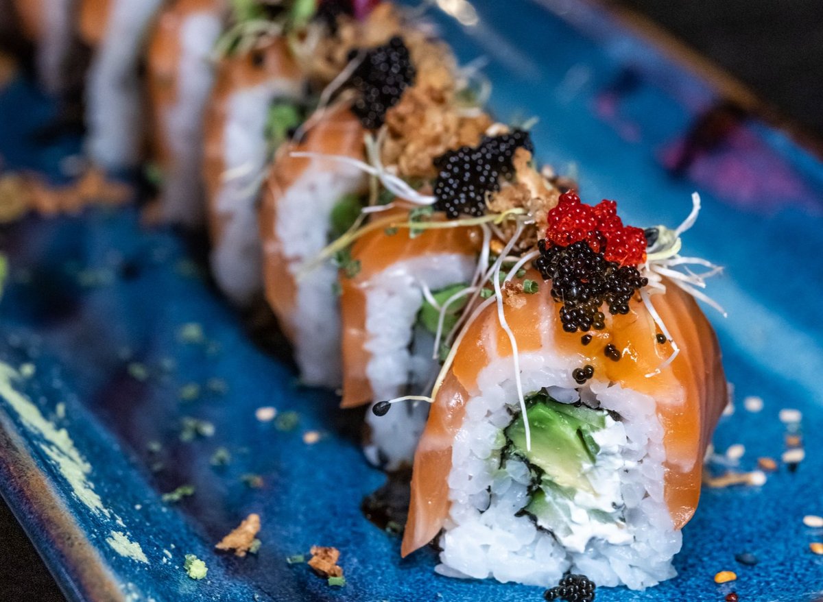 Avokado, philadelphiaost och gurka. Toppas med laxtartar och tempura crunch.