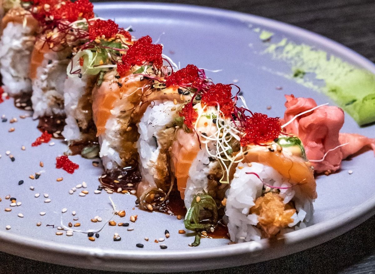 Tempurarulle-lax, avokado och philadelphia. Toppad med teriyakisås och chilimajo.