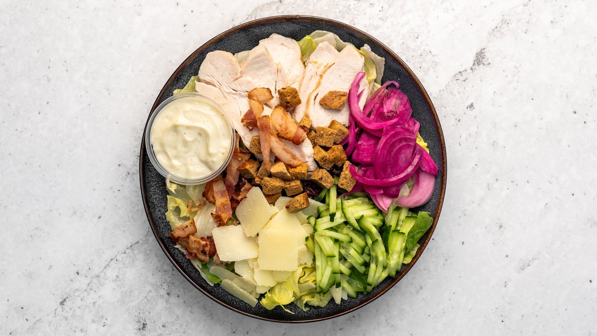 Salladsmix, svart ris, svensk kycklingfilé, bacon, grana padano, gurka, picklad rödlök, glutenfria krutonger och caesardressing.