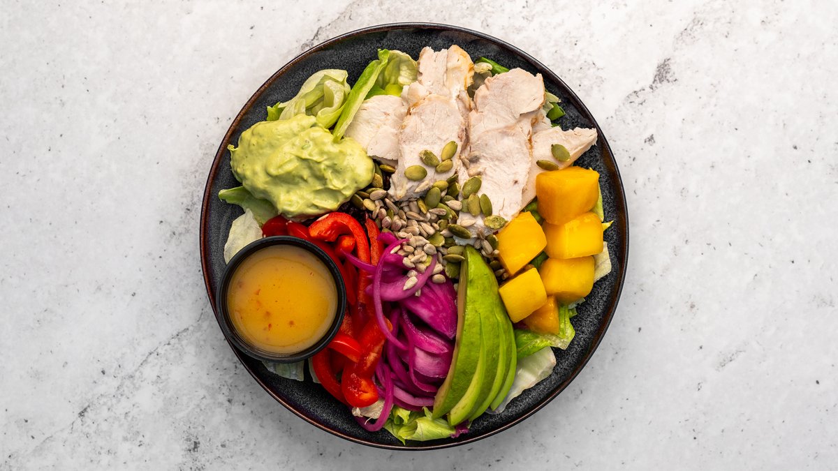 Salladsmix, svart ris, svensk kycklingfilé, avokado, avokadomousse, mango, picklad rödlök , paprika, mango chili krydda, rostade solrosfrön, rostade pumpafrön och mango chili dressing.