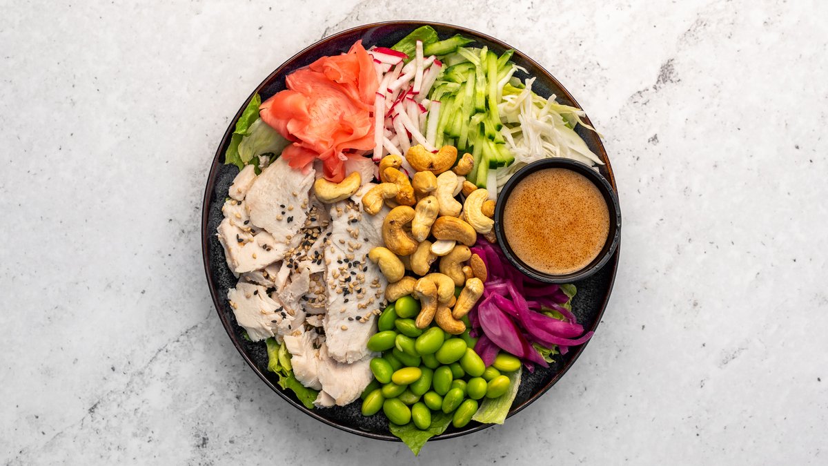 Salladsmix, svart ris, svensk kycklingfilé, edamame, gurka, rädisa, syltad ingefära, picklad vitkål, picklad rödlök, sesamfrön, rostade cashewnötter och miso ginger dressing.