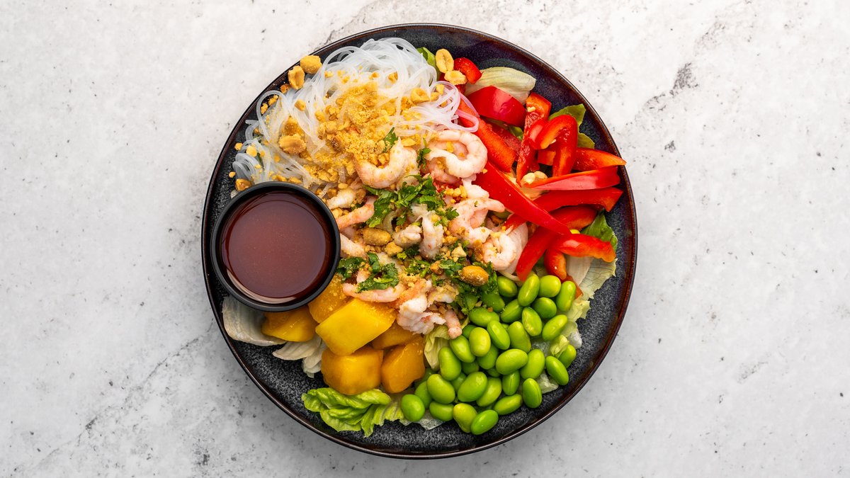 Salladsmix, gladnudlar, handskalade räkor ( MSC-märkta ), mango, edamame, picklad morot, paprika, koriander, rostade jordnötter och asiatisk dressing.