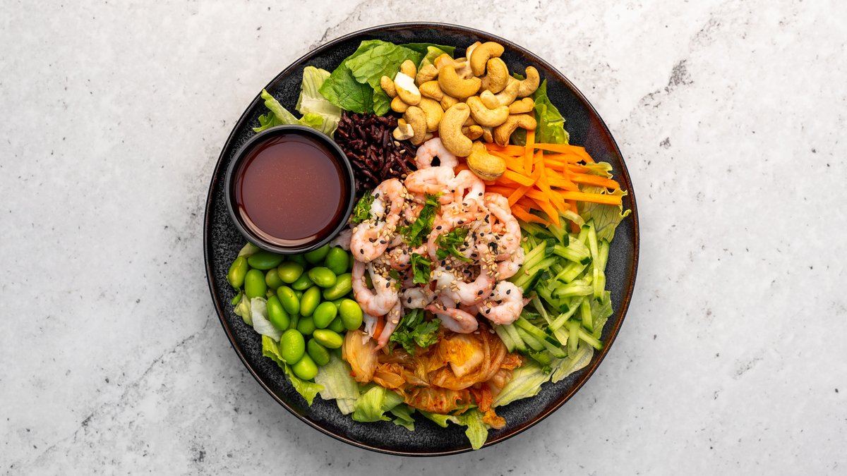 Salladsmix, svart ris, handskalade räkor (MSC-märkta), edemame, hemgjord kimchi, gurka, picklad morot, koriander, sesamfrön, rostade cashewnötter och basilika dressing.