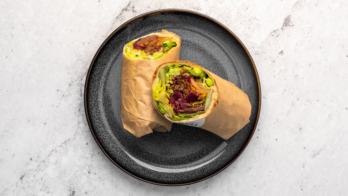 Tortillabröd, salladsmix, pulled beef, edamame, hemgjord kimchi, gurka, picklad rödlök, koriander, rostade jordnötter och chili mayo dressing.