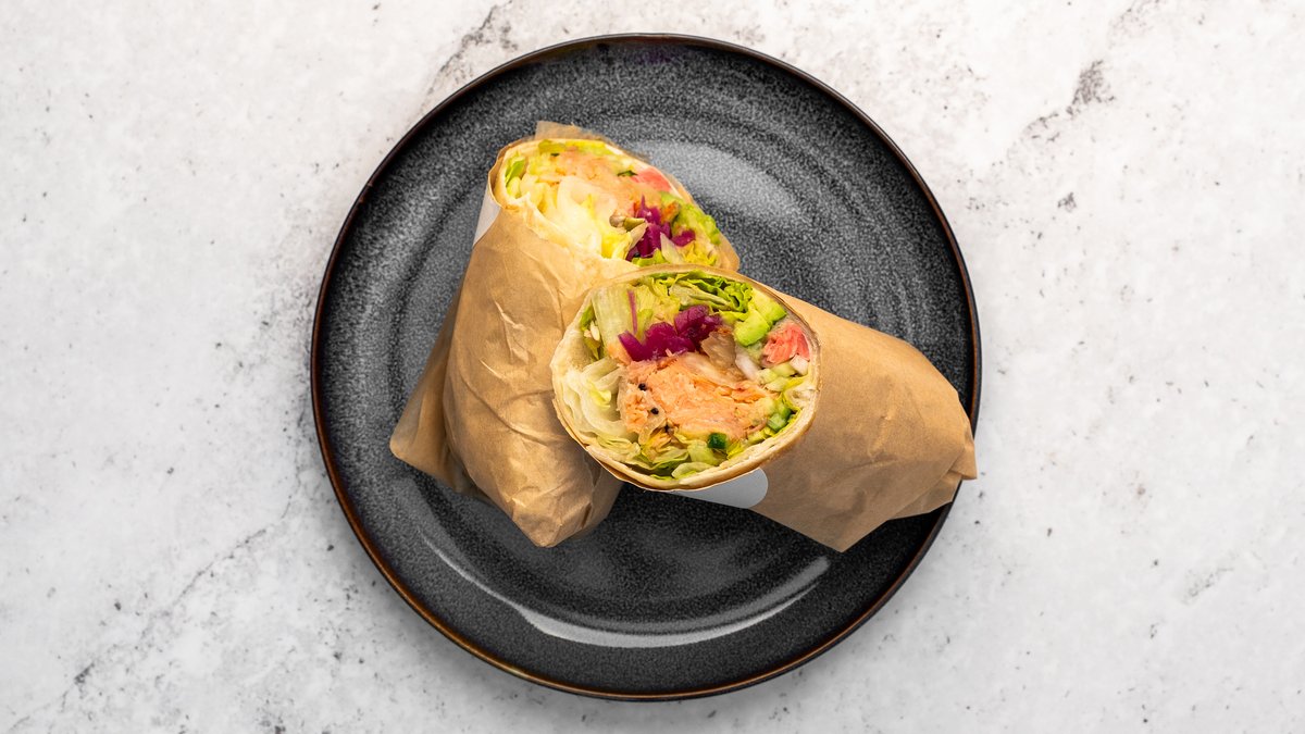 Tortillabröd, salladsmix, varmrökt lax, avokado, syltad ingefära, hemgjord kimchi, gurka, picklad rödlök, rädisa, sesamfrön, rostade pumpafrön, rostade solrosfrön och spicy mayo dressing.