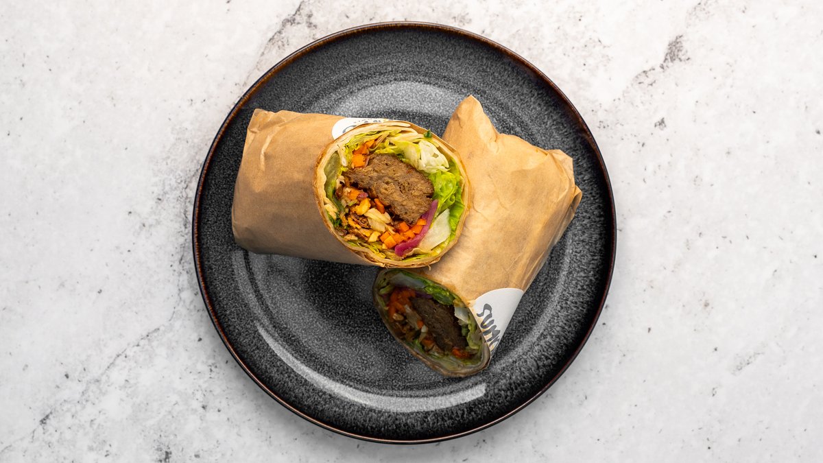 Tortillabröd, salladsmix, beyond meat, gurka, picklad rödlök, picklad morot, picklad vitkål, koriander, mynta, rostad lök, rostade jordnötter, chili soy och sweet spicy dressing.