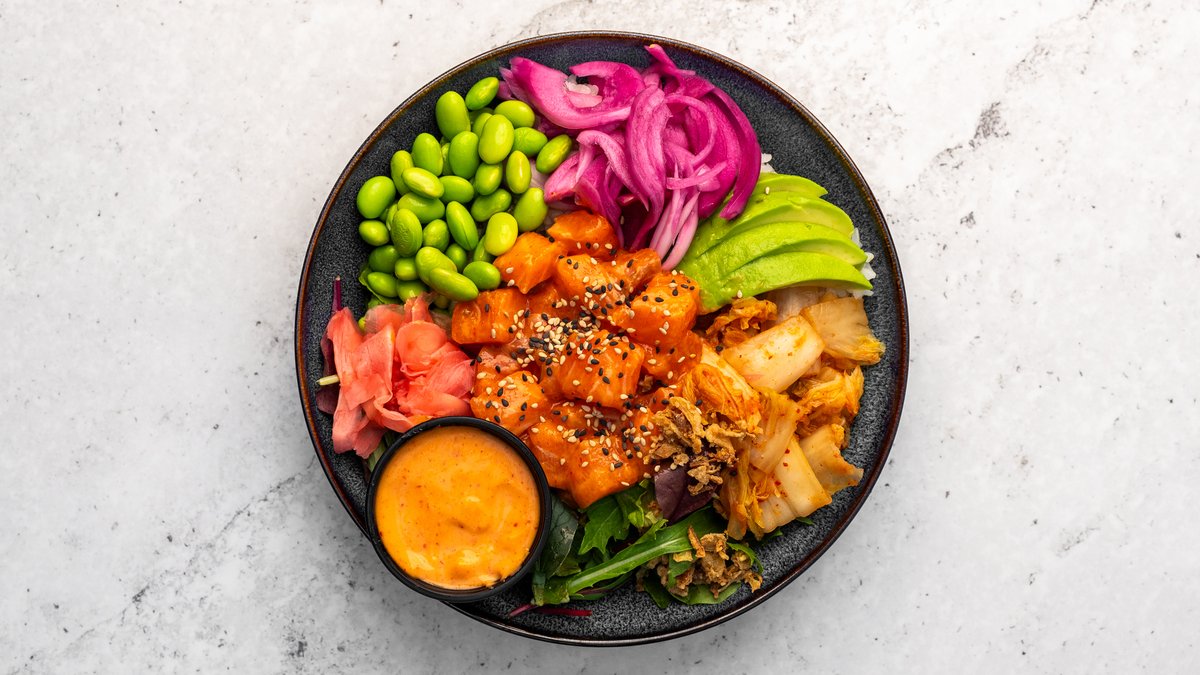 Chiliarinerad lax, avokado, edamame, kimchi, syltad ingefära, picklad rödlök, salladsmix, sesamfrön, rostad lök och valfri sås.
