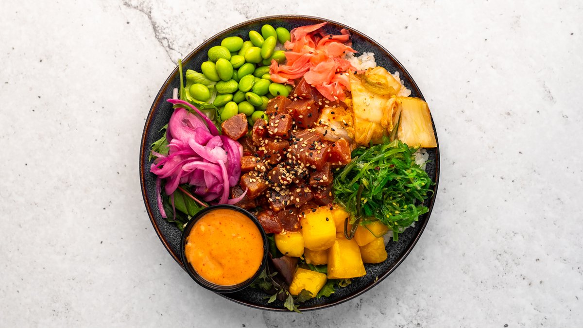 Chilimarinerad tonfisk, avokado, mango, edamame, kimchi, syltad ingefära, picklad rödlök, salladsmix, rostad lök, sesamfrön och valfri sås.