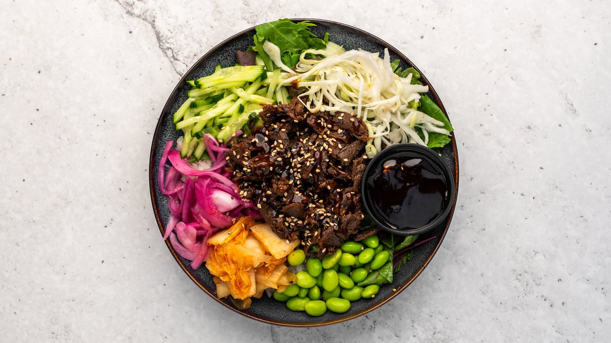 Yakiniku, edamame, kimchi, gurka, picklad rödlök, picklad vitkål, salladlök, salladsmix, teriyakisås, sesamfrön och valfri sås.