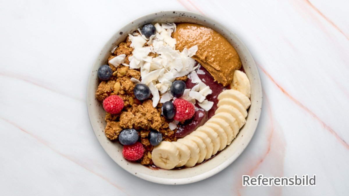 Acai, banan och agave. Toppas med granola, banan, blåbär, jordgubbar, riven kokos och valfritt tillbehör.