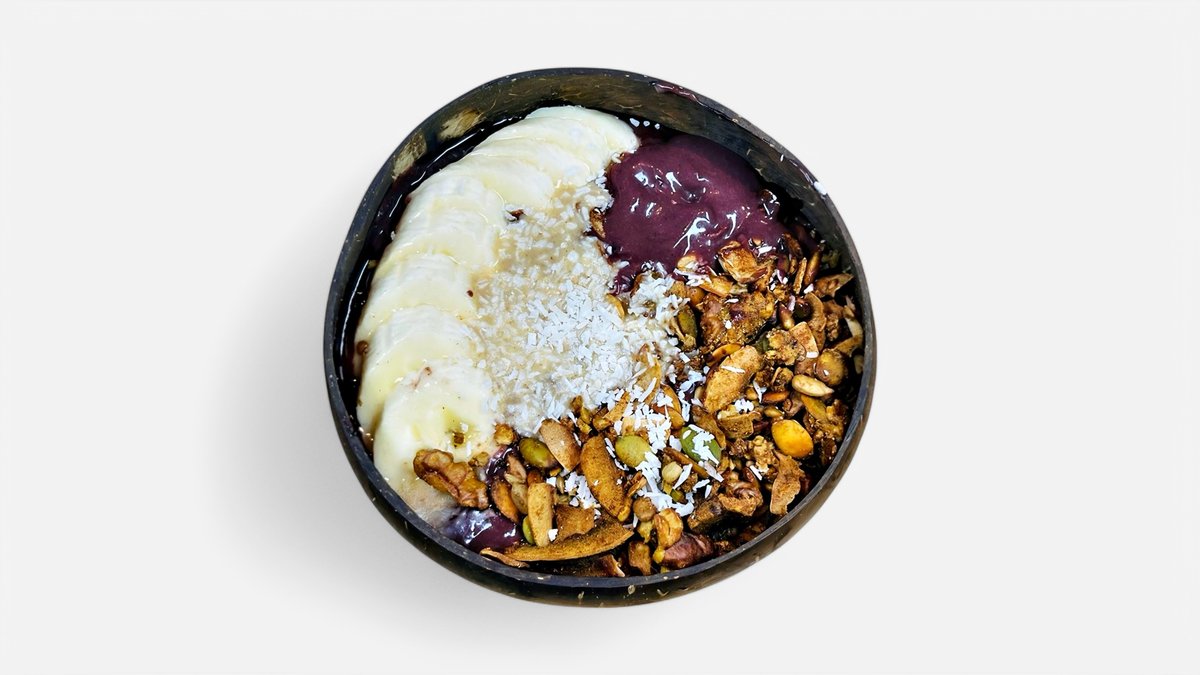 Acai, banan och agave. Toppas med granola, banan, riven kokos och valfritt tillbehör.