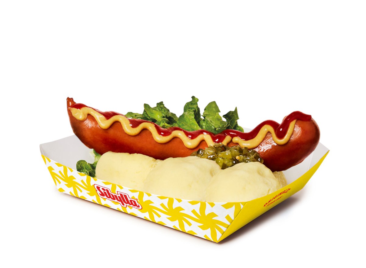 1 kokt, grillad eller sojabaserad korv, isbergssallad, ketchup, senap och mos. Valfri dryck ingår.