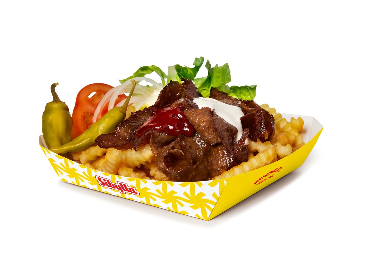 Kebabkött, isbergssallad, gul lök skivad, tomat, feferoni, 2 st valfria såser och pommez.