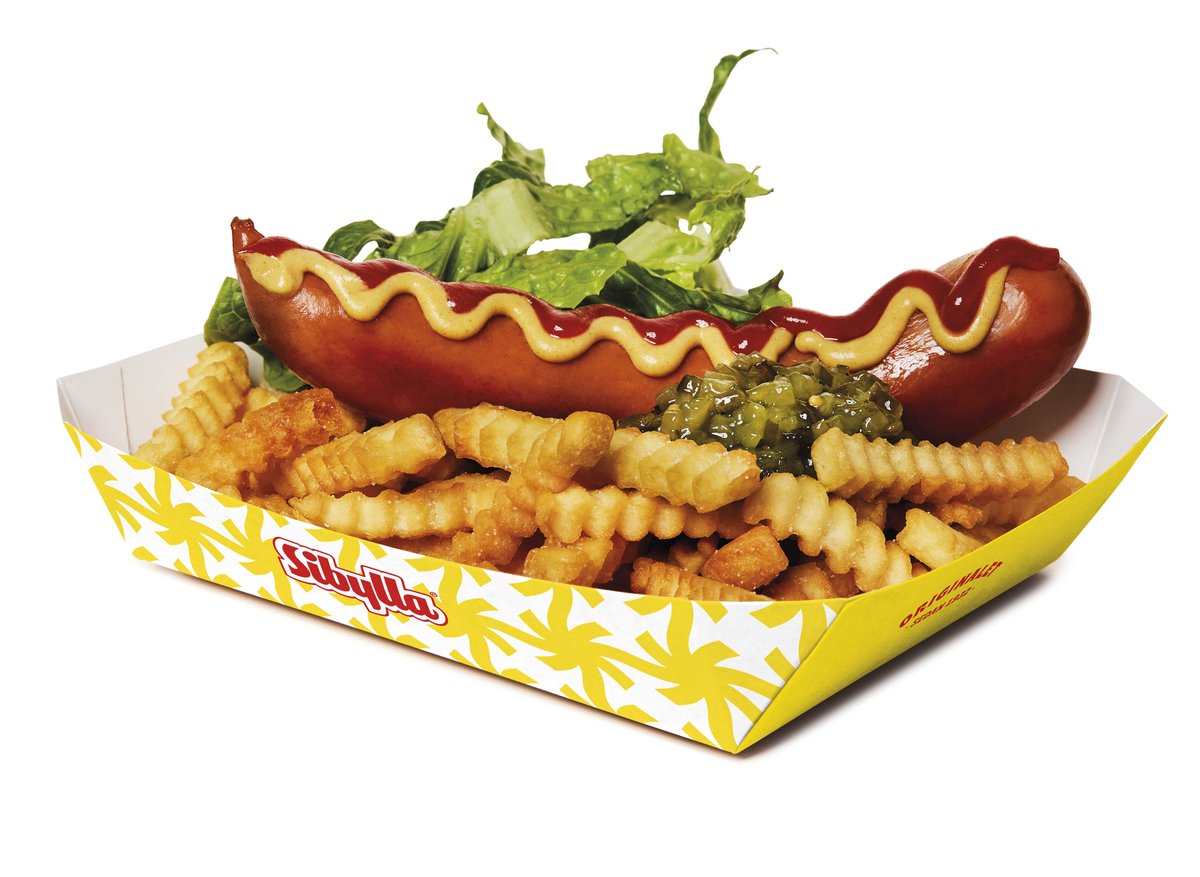 1 st kokt, grillad eller sojabaserad korv, pommez, isbergssallad, ketchup och senap.