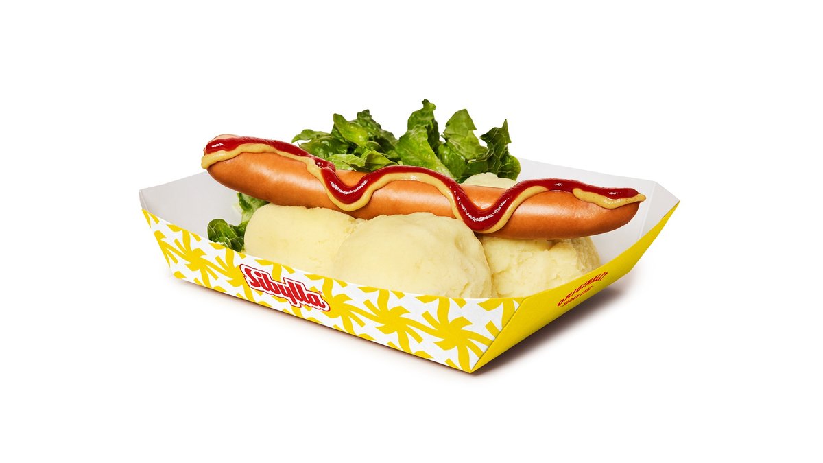 1 st kokt, grillad eller sojabaserad korv, mos, isbergssallad, ketchup och senap. Valfri dryck ingår.