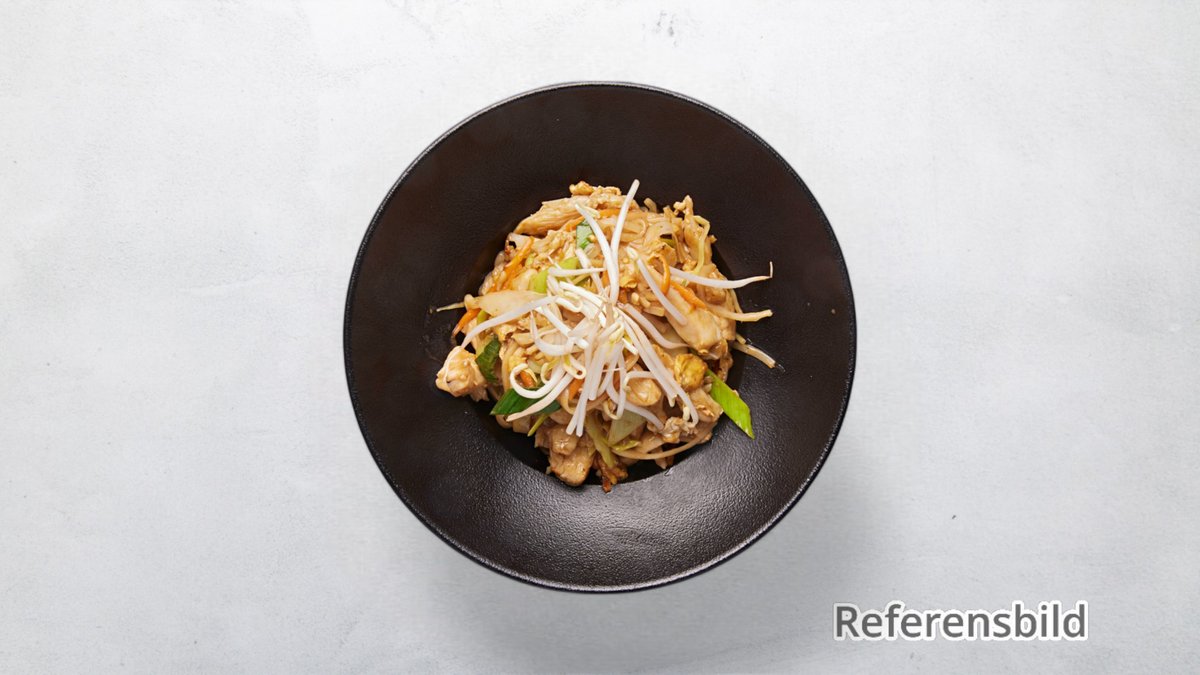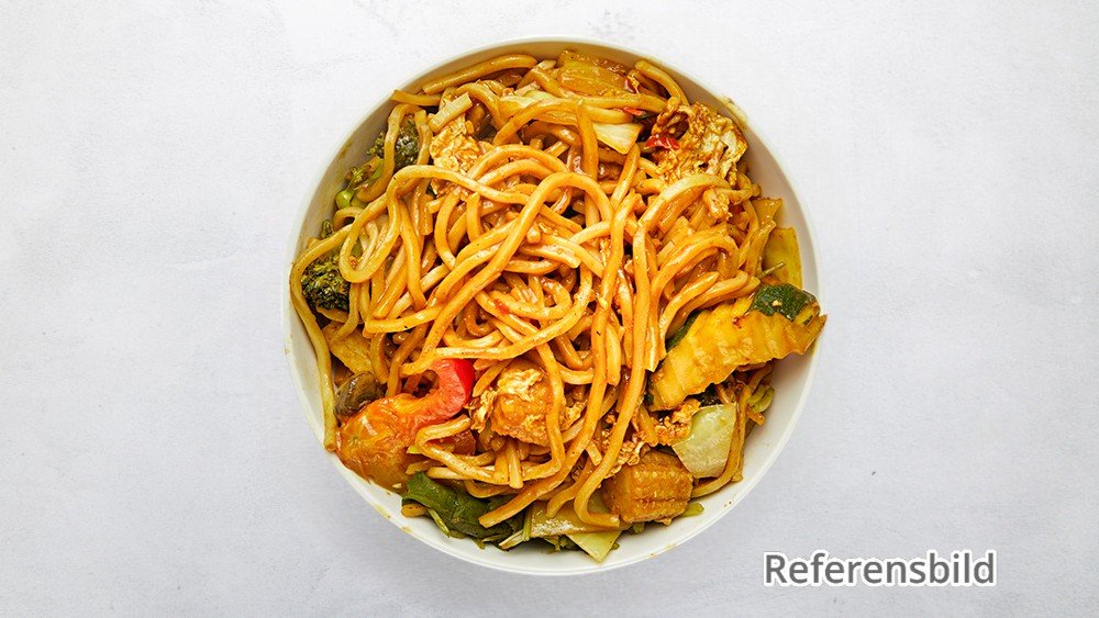 Wokad äggnudlar med kycklingfilé och grönsaker.