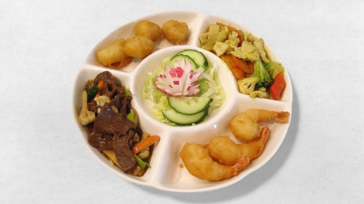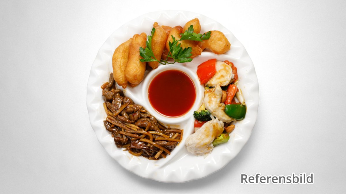 Förrätt: vårrulle Varmrätt: fyra små rätter - friterade räkor med sötsur sås - friterad kyckling med sötsur sås - wokad biff med bambuskott - kycklingfilé i currysås Dessert: friterad banan med glass eller glass med chokladsås. Välj dessert i nästa steg.