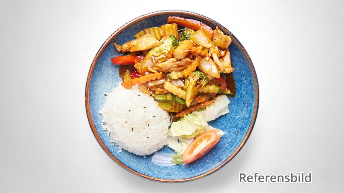 Förrätt: vårrulle. Varmrätt: - friterade räkor med sötsur sås. - wokad biff med grönsaker, vitlökchili. - wokad kycklingfilé med söt masaman, curry, kokos, ingefära. Dessert: friterad banan med glass eller glass med chokladsås. Välj dessert i nästa steg.