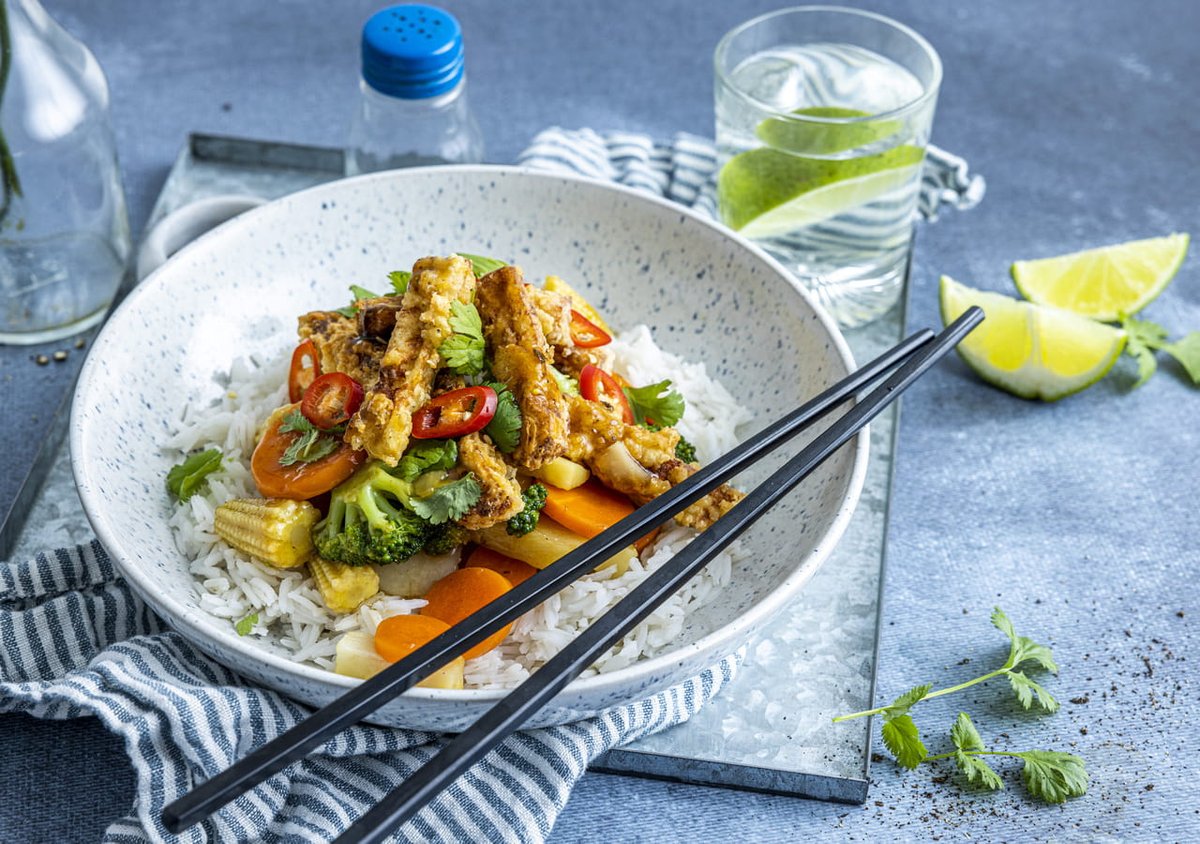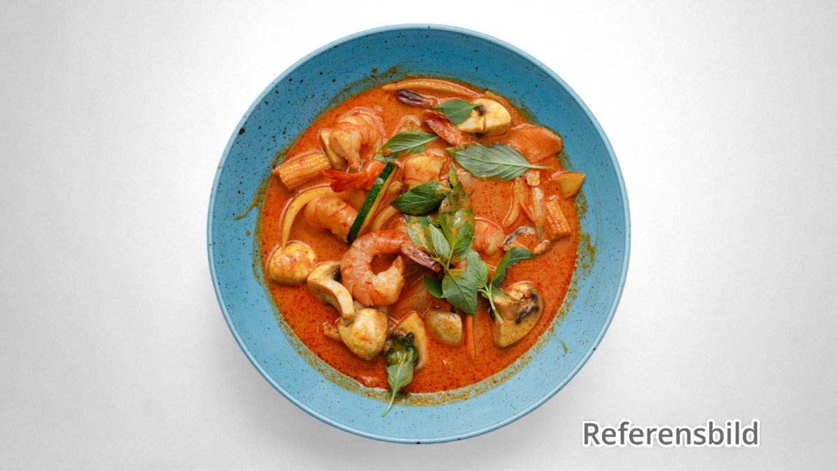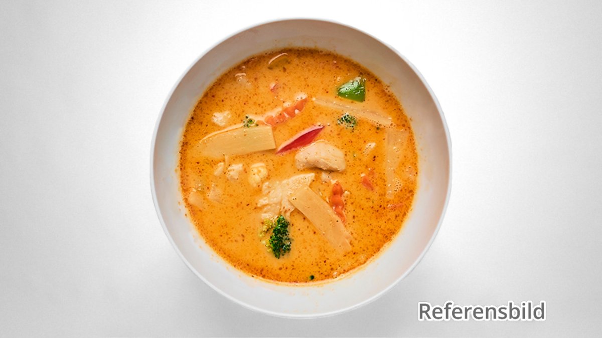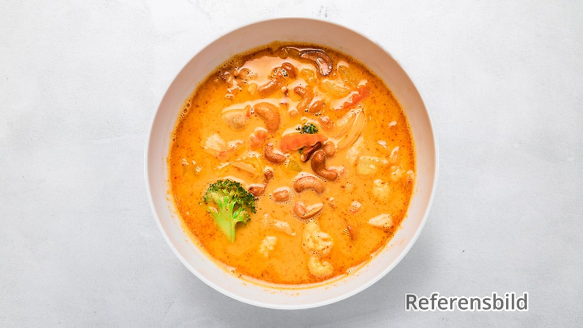 Serveras med gul currysås.