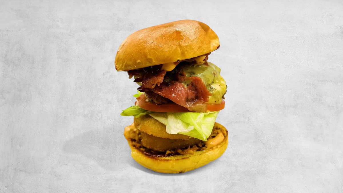 2x 100 gr pattie, bacon, double, cheddarost, lökringar, tomat, isbergssallad, jalapeno, BBQ-sås, chilimajonnäs och rostad lök.