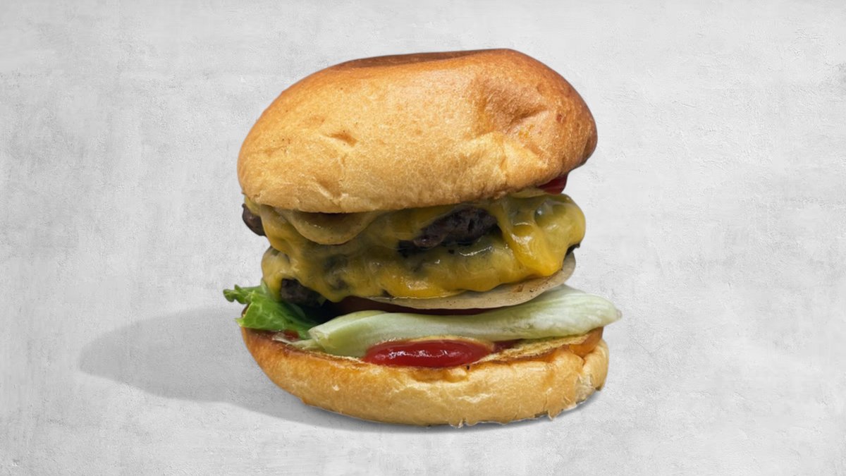 2x 100 gr pattie, dubbel cheddarost, lök, tomat, isbergssallad, senap och ketchup.
