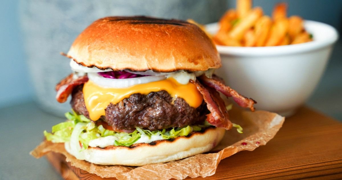 150 gr pattie, tryffelmajonnäs, sallad, picklad, rödlök, cheddarost, bacon och ostkräm.