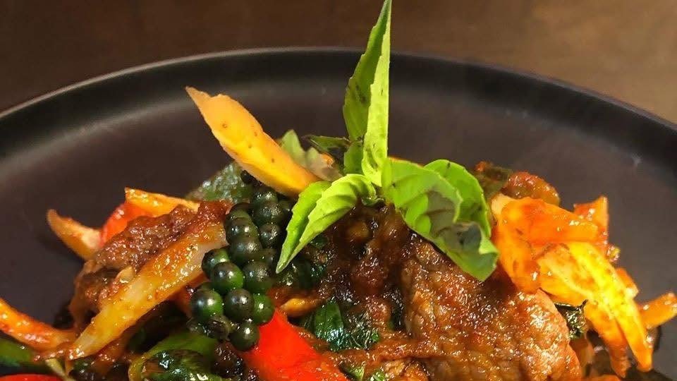 Biff med grönsaker, chili pasta på thailändsk vis.
