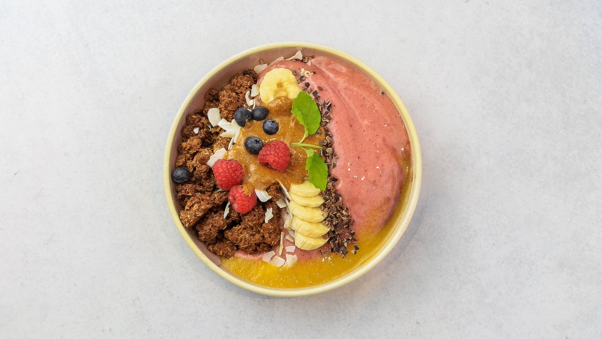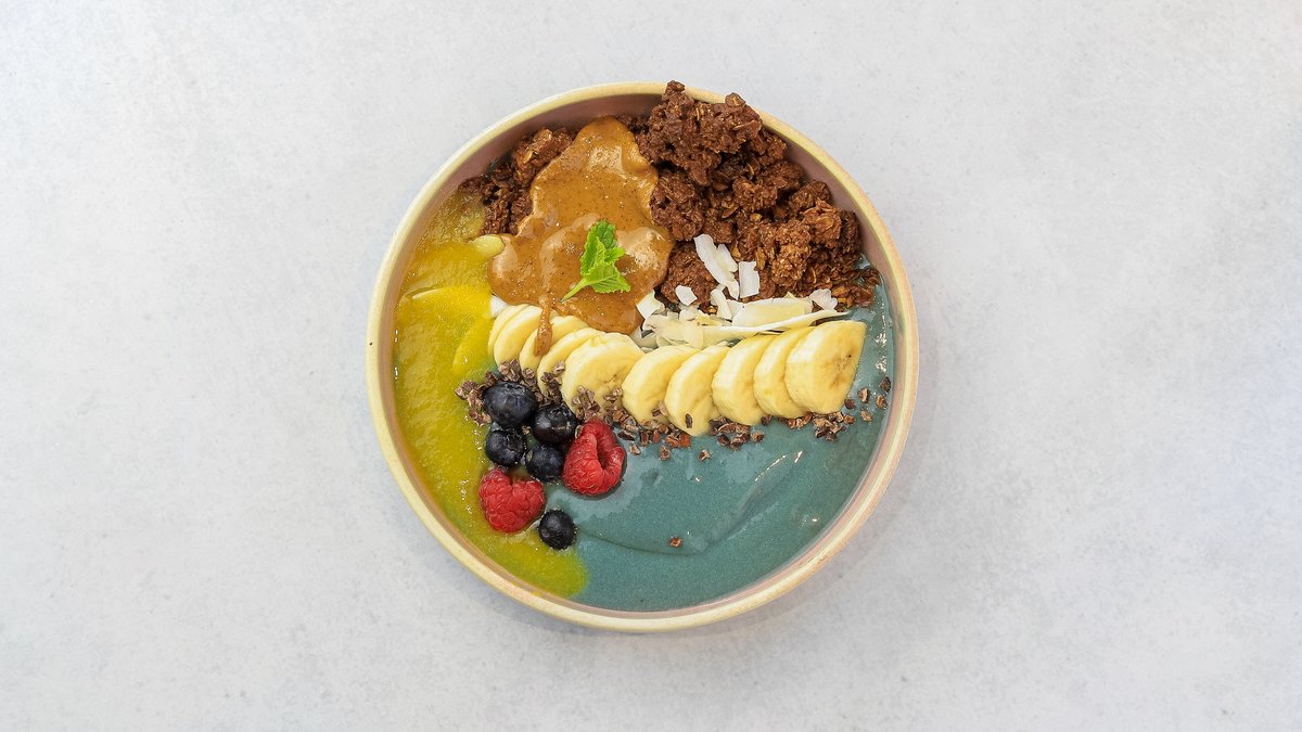 Serveras med ananas, mango, passionsfrukt, banan och spirulina.