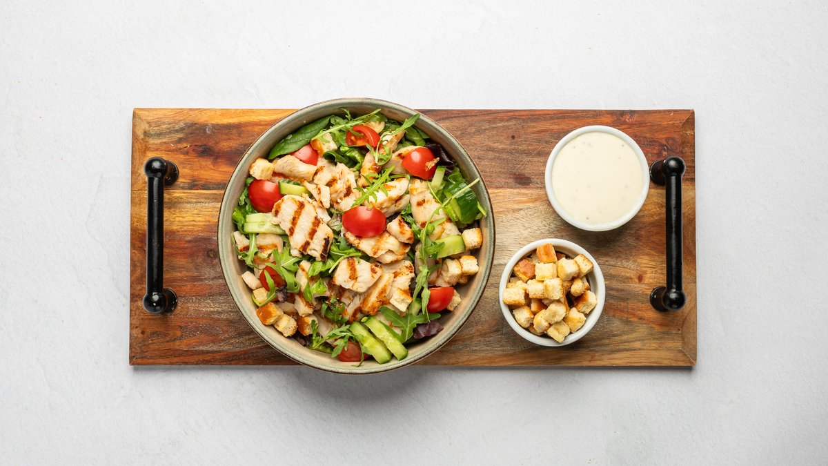 Kyckling, sallad, ruccola, tomat, gurka, parmesan, krutonger och ceasardressing.