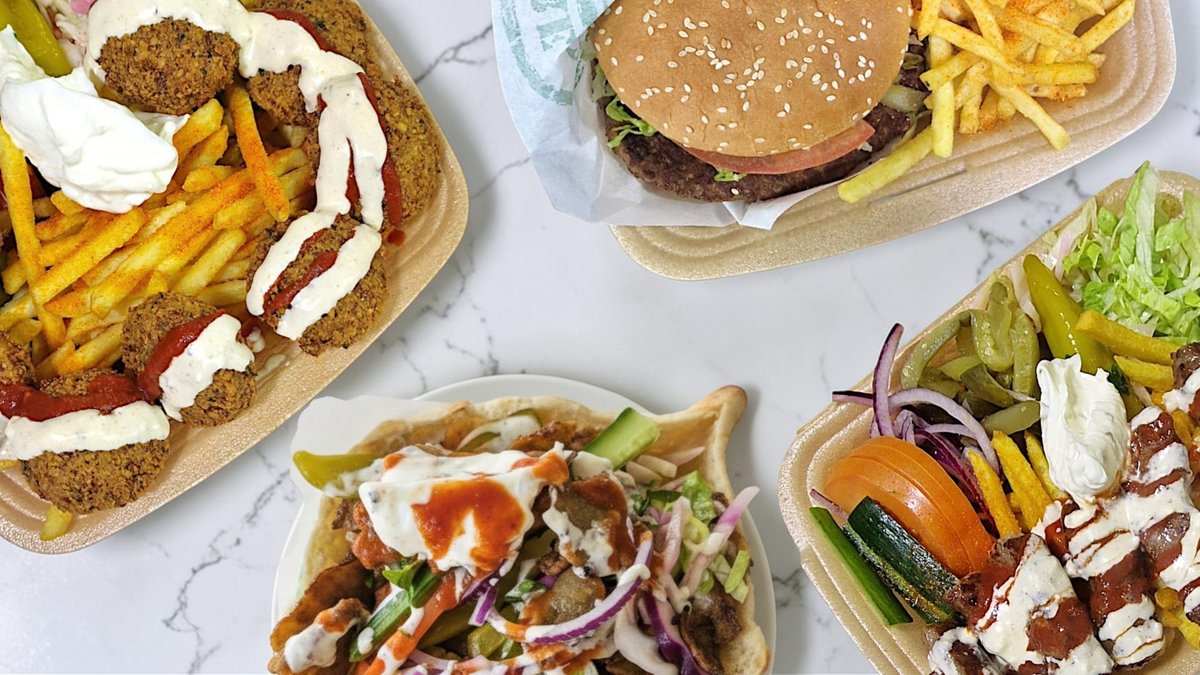 Kebab, kyckling och falafel och grönsaker.