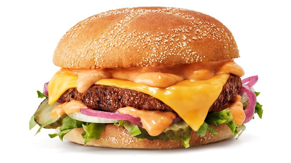 Burgare av svenskt nötkött med cheddarsmältost, tomat, isbergssallad, gul lök, originaldressing, och sesambröd. Serveras med tillbehör och dryck. 3,1 kg CO2e