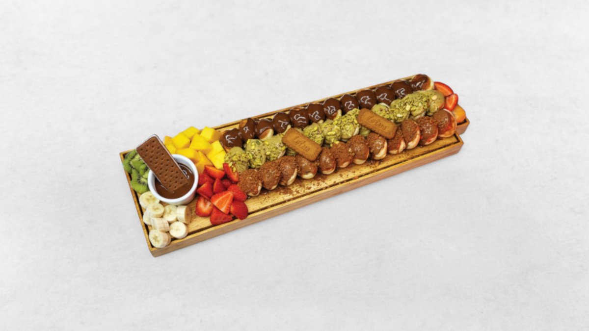 Krispig kunafa med pistagekräm, Nutella choklad och jordgubbar.