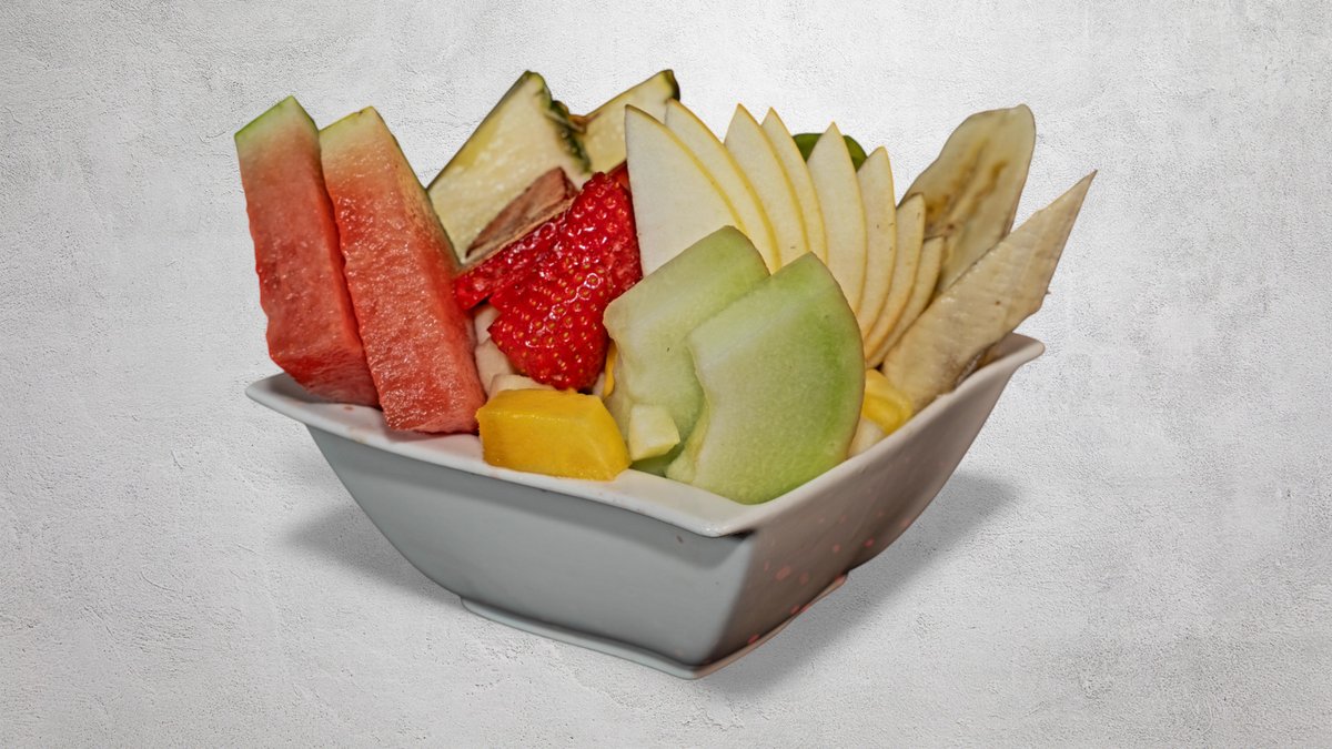 Ananas, banan, jordgubbar, mango, äpple, melon och vattenmelon.