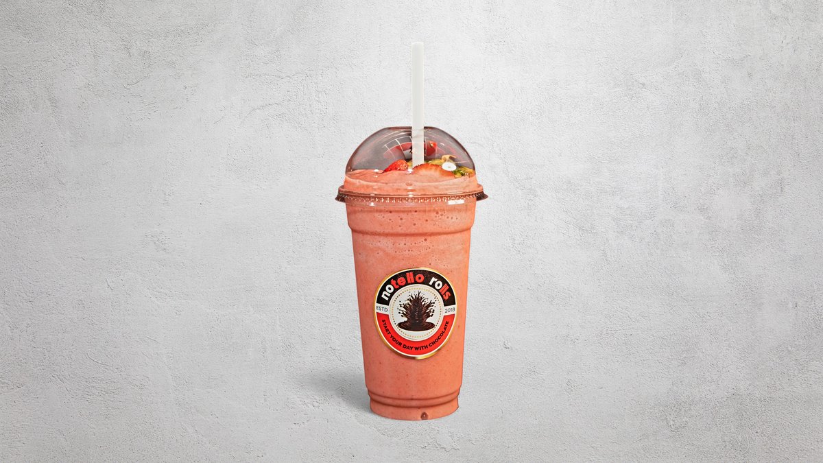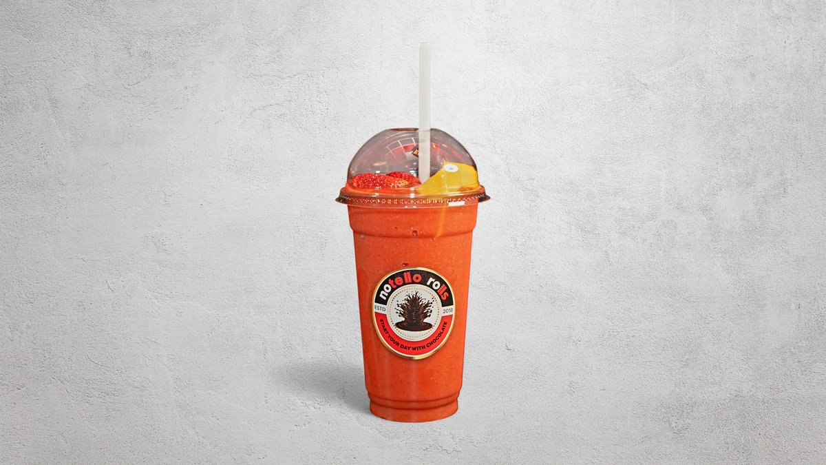 Med jordgubbar och mjölk. Jordgubbar, ananas, mango ingår.