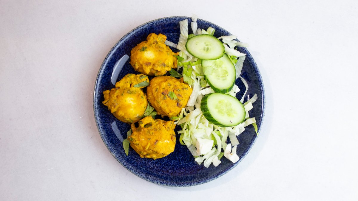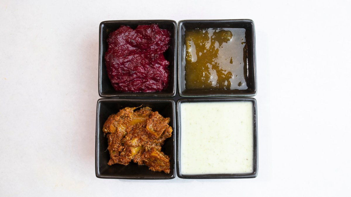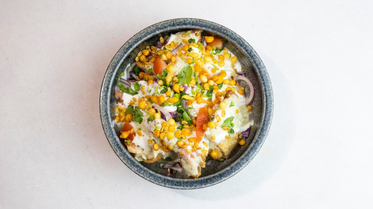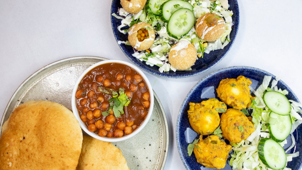 Serveras med pani puri, chicken delight, masala papad och ägg bajji.