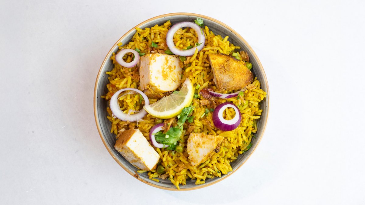 Ris tillagad med grönsaker och paneer. Serveras med sherva och raita.