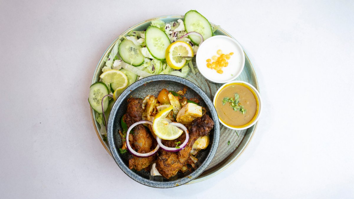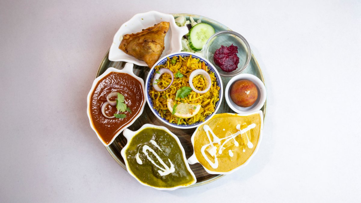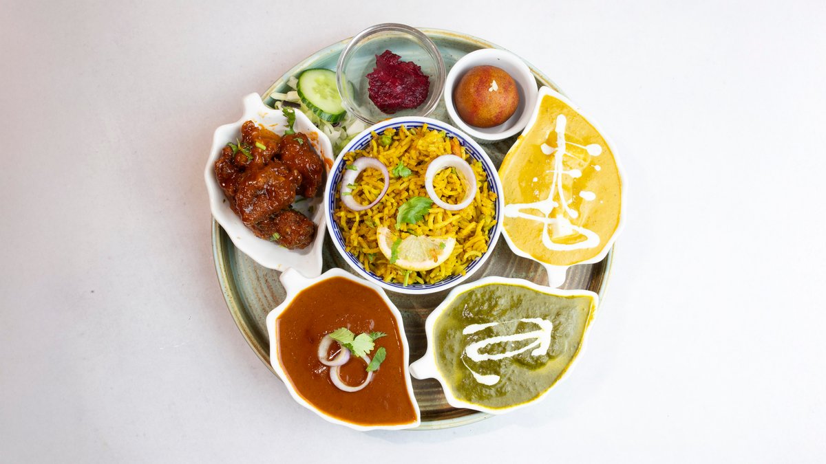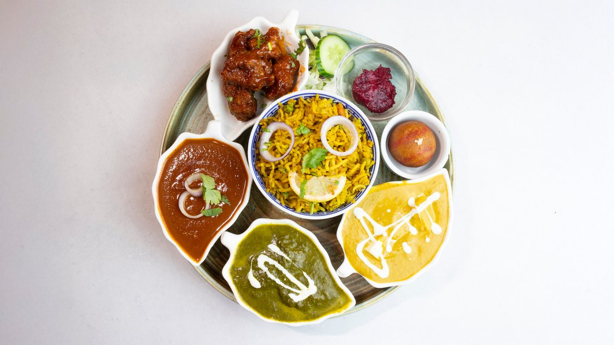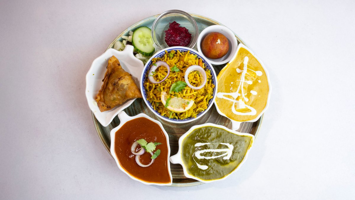 Serveras med 1 förrätt, puri, 1 kycklingrätt, 1 lammrätt, sallad, pickle, papad, ris, smaksatt ris och efterrätt.