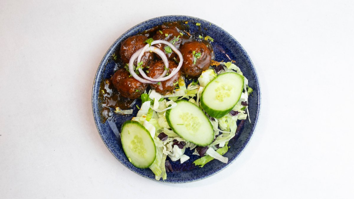 Grönsaksfritter i en blandning av soja, vitlök och chilisåser.