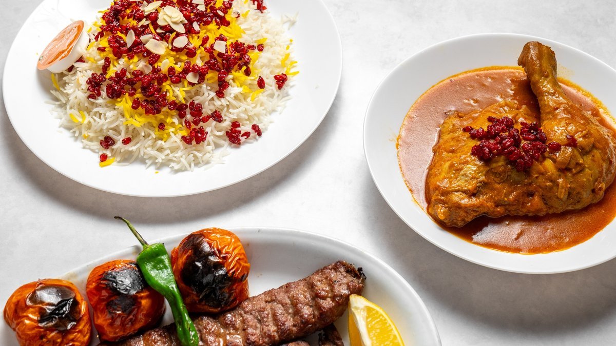 Ryggbiffspett, kebabspett och kycklingspett med grillade tomater, saffran, berberis, mandel och citron. Serveras med basmatiris.