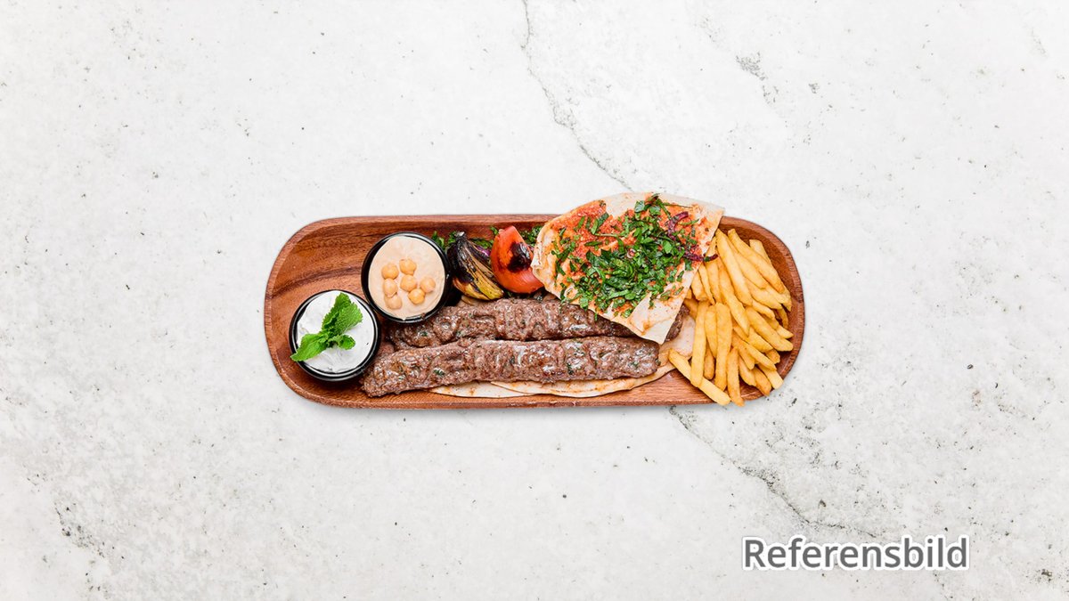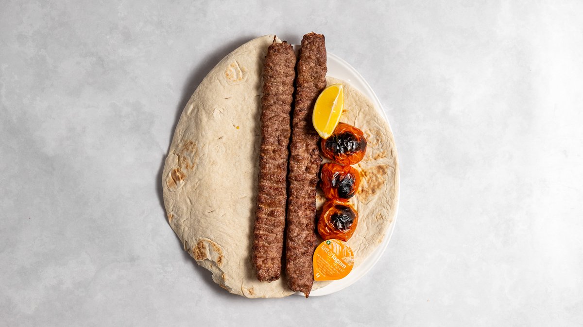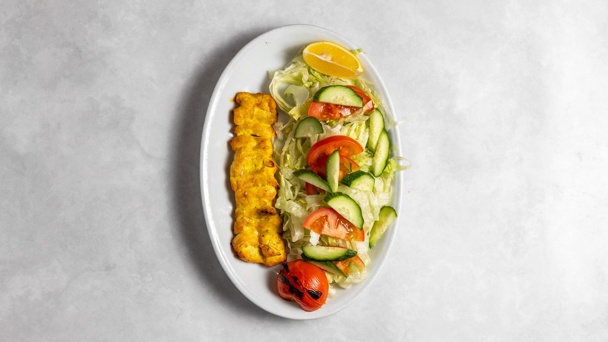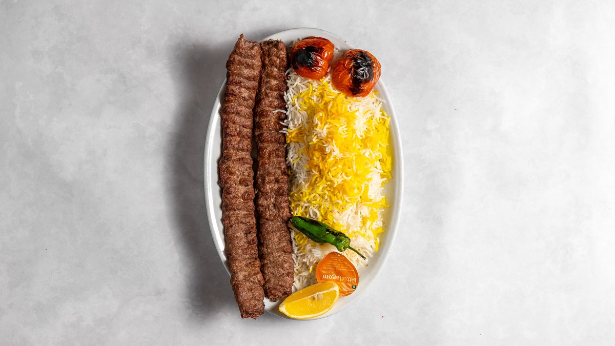Kebabspett med grillad tomat. Serveras med basmatiris.