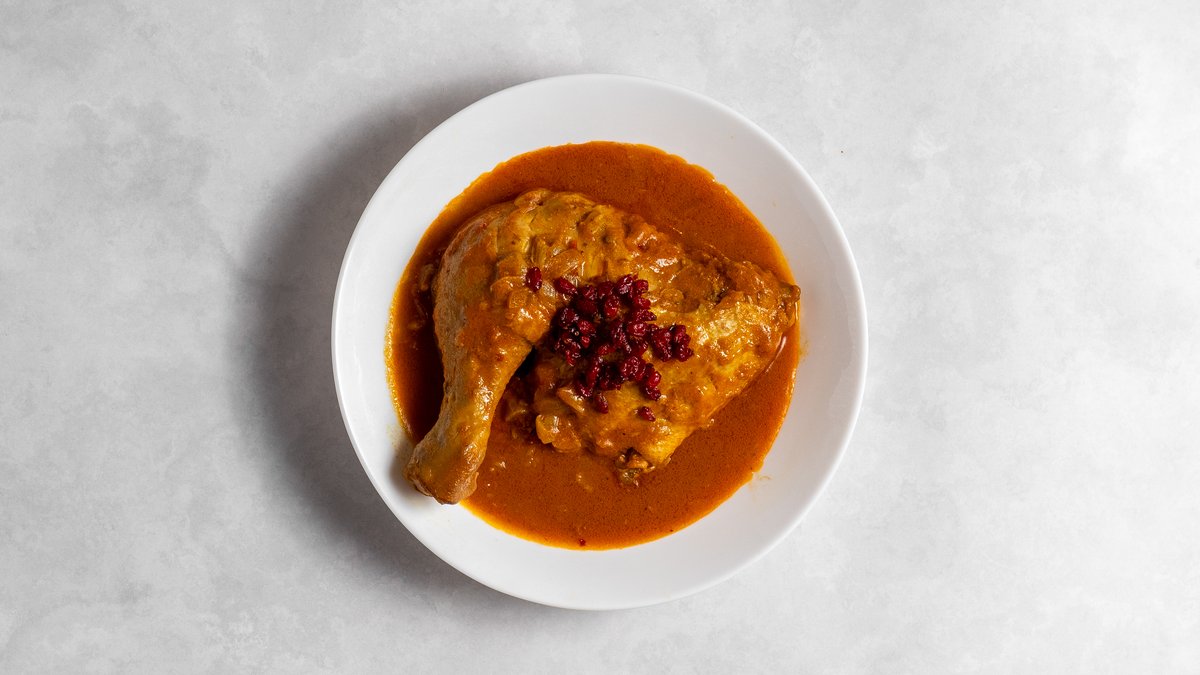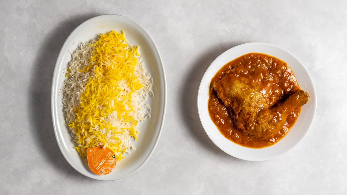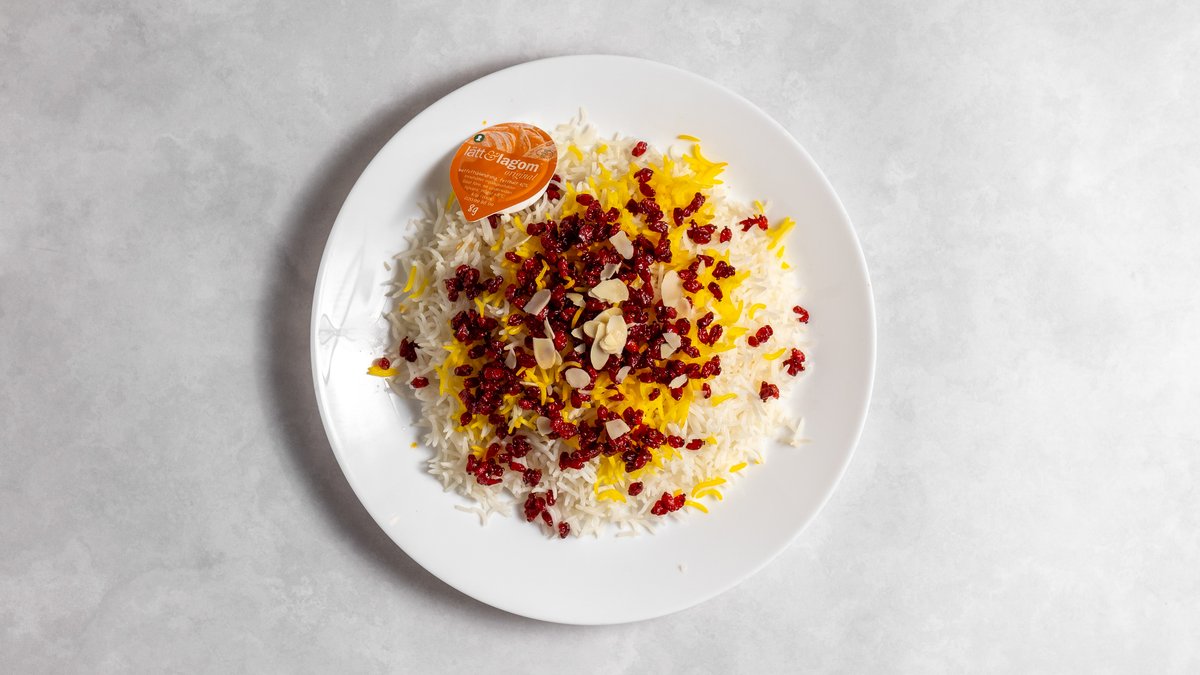 Kycklingspett, berberis, saffran och mandel. Serveras med basmatiris.